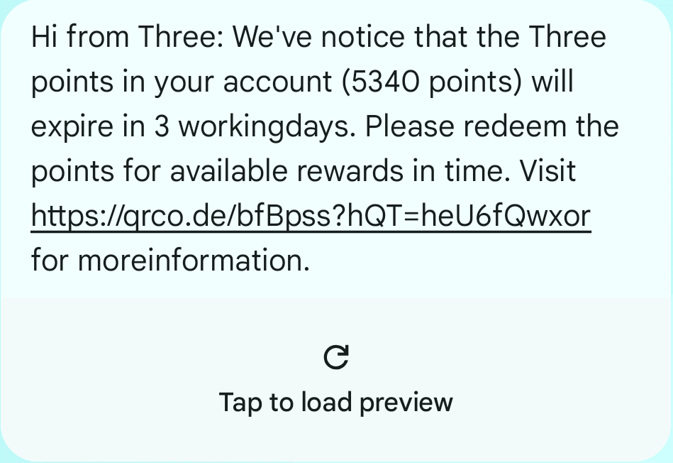 A new scam text impersonating the mobile network Three is doing the rounds making claims there are ‘points’ in your account that expire in three working days.