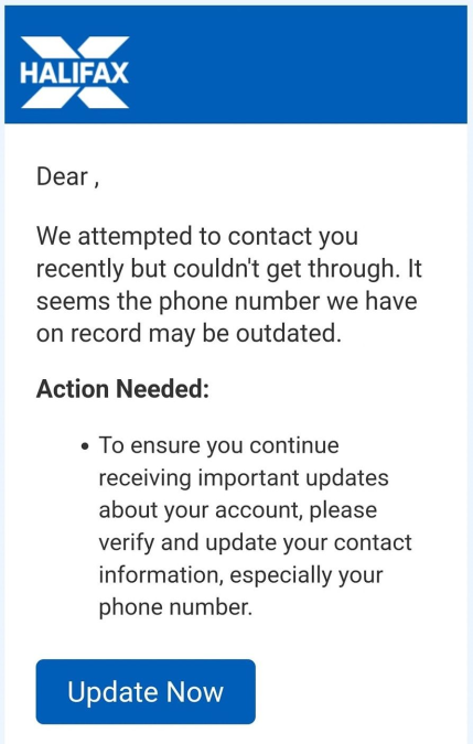 A scam email impersonating banking giant Halifax informs you that the bank has tried to get in contact with you but couldn’t, and needs you to update your information.