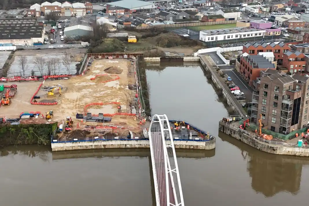 “On site, work is taking place to prepare the area ready for the smaller basin bridge and the ramps and footpaths that will lead to the main bridge on each side of the river.”