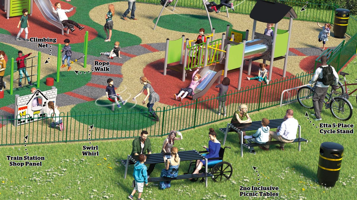 The park will have over 20 new pieces of equipment including balance beams, Olympic basket swings, a wheelchair accessible roundabout, climbing net, multi play unit and more. As well as the play facilities themselves, tables and chairs, cycle stands and a wildflower area also form part of the works.